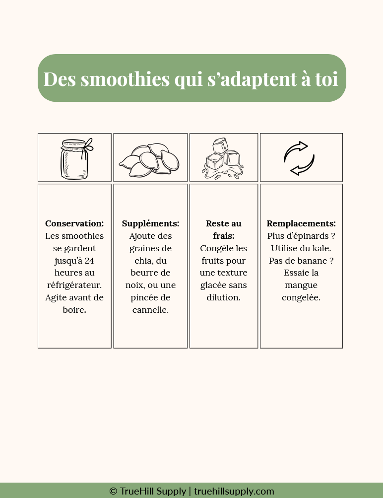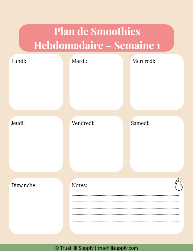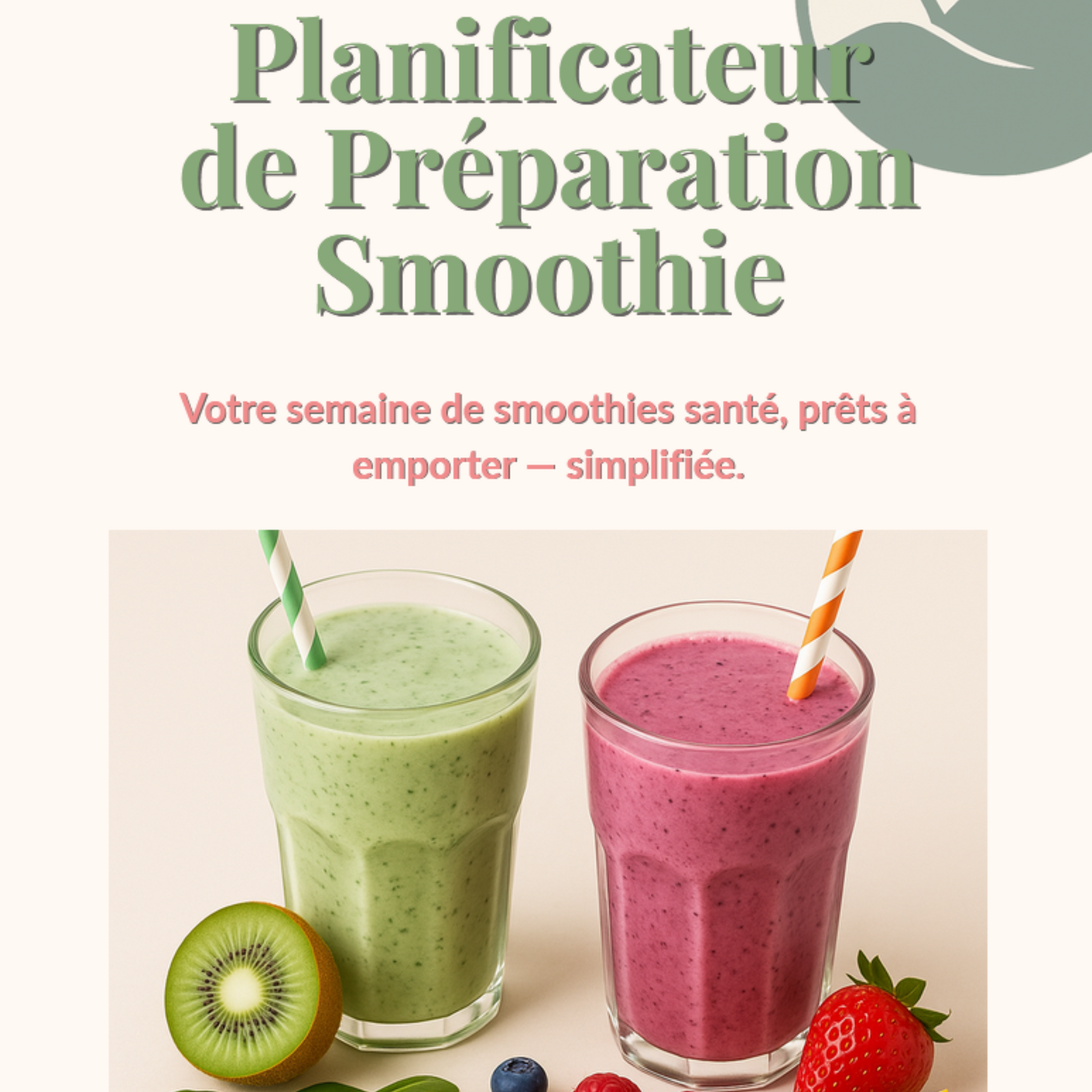 Un joli planner de 20 pages conçu pour rendre la préparation de vos smoothies simple, rapide et sans stress — idéal pour les mamans pressées.